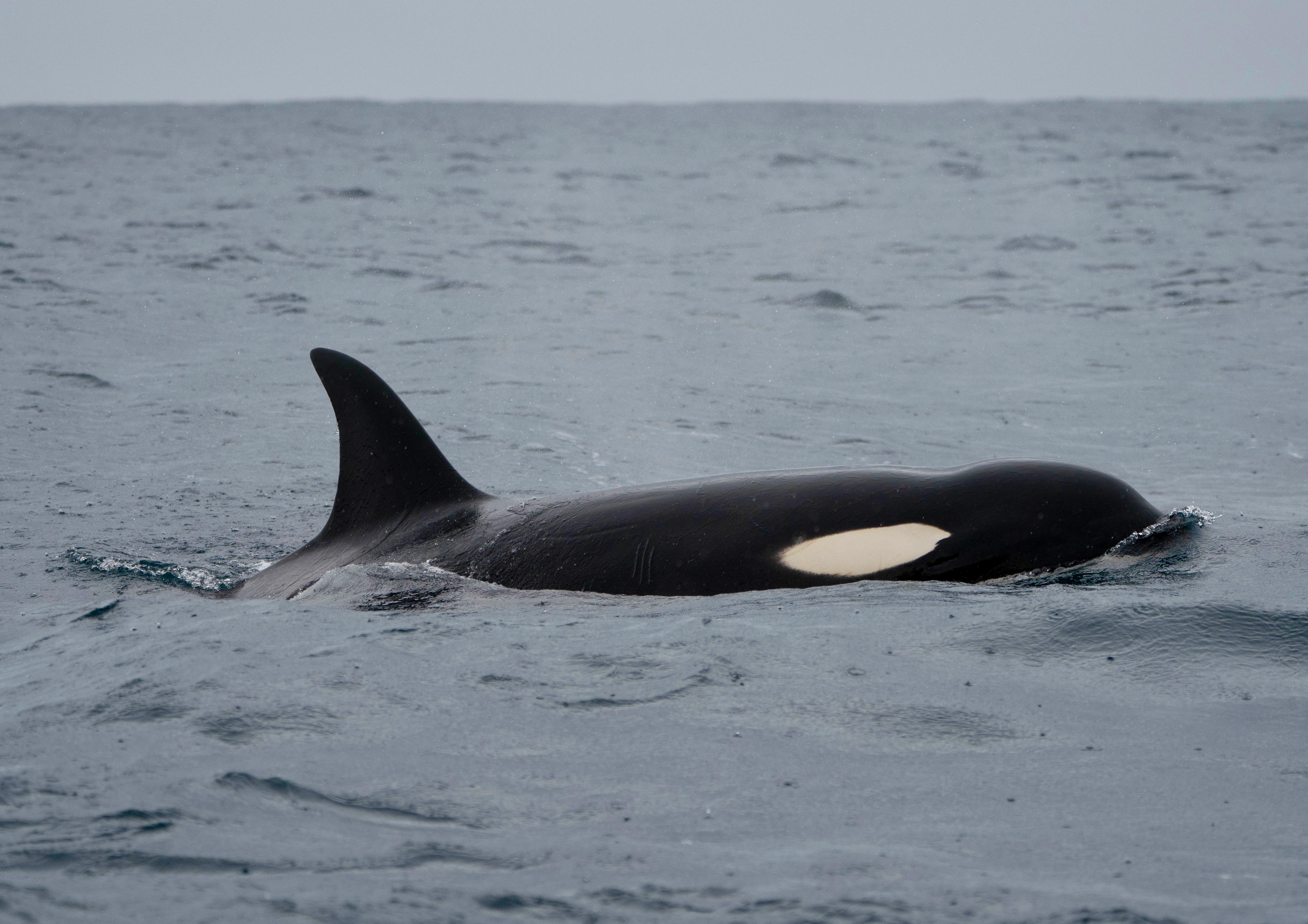 There was one individual Orca, which was much larger than the others, believed to be a dominant male with a dorsal fin almost 2 metres high. He was circling the boat for some time and seemed curious and active. The other Orcas often followed him.